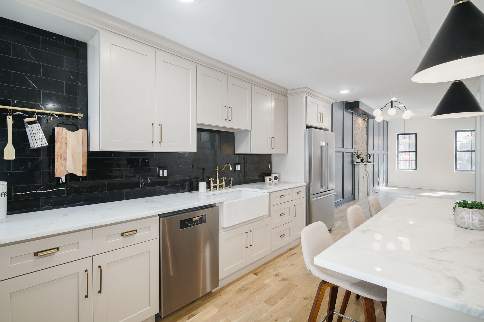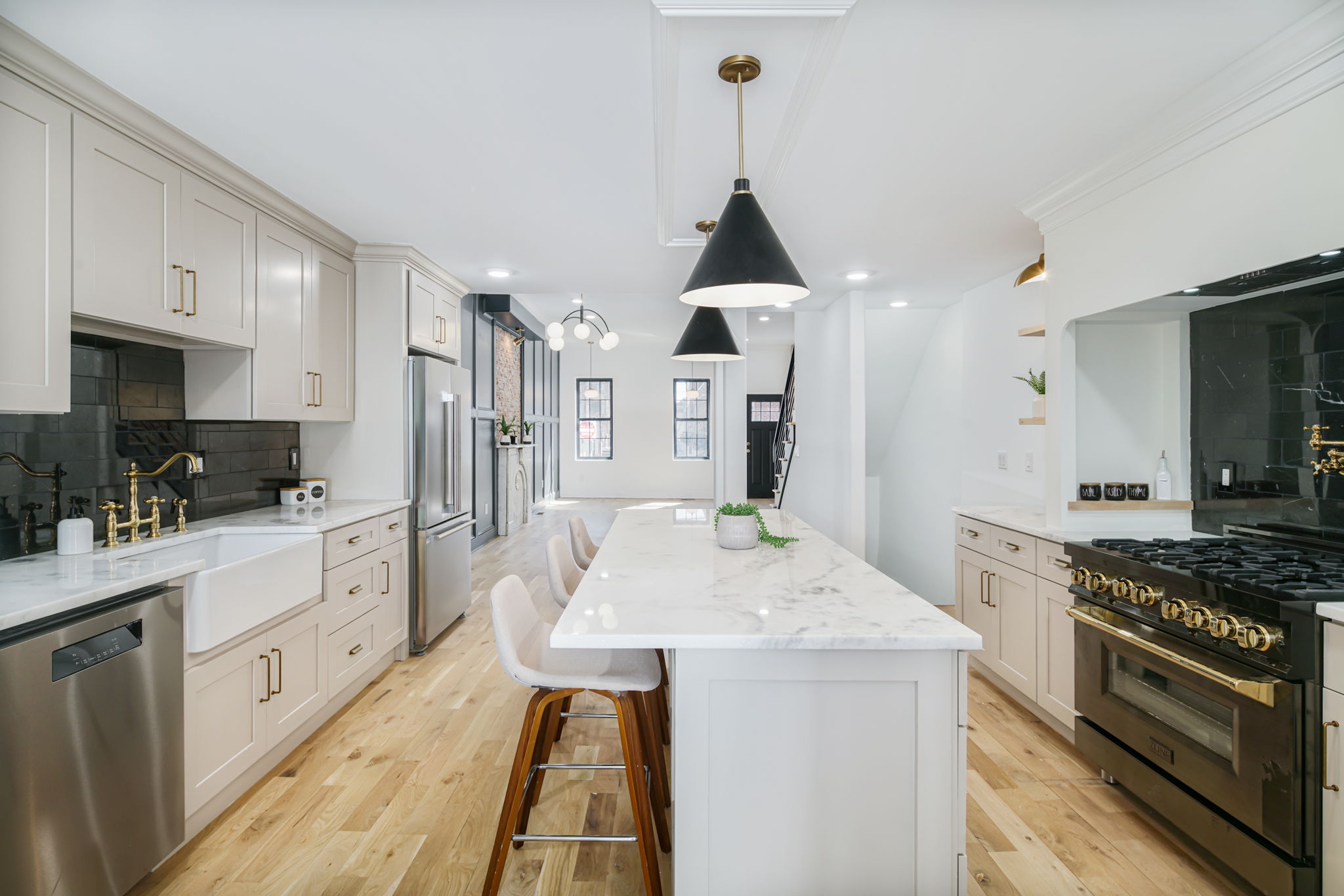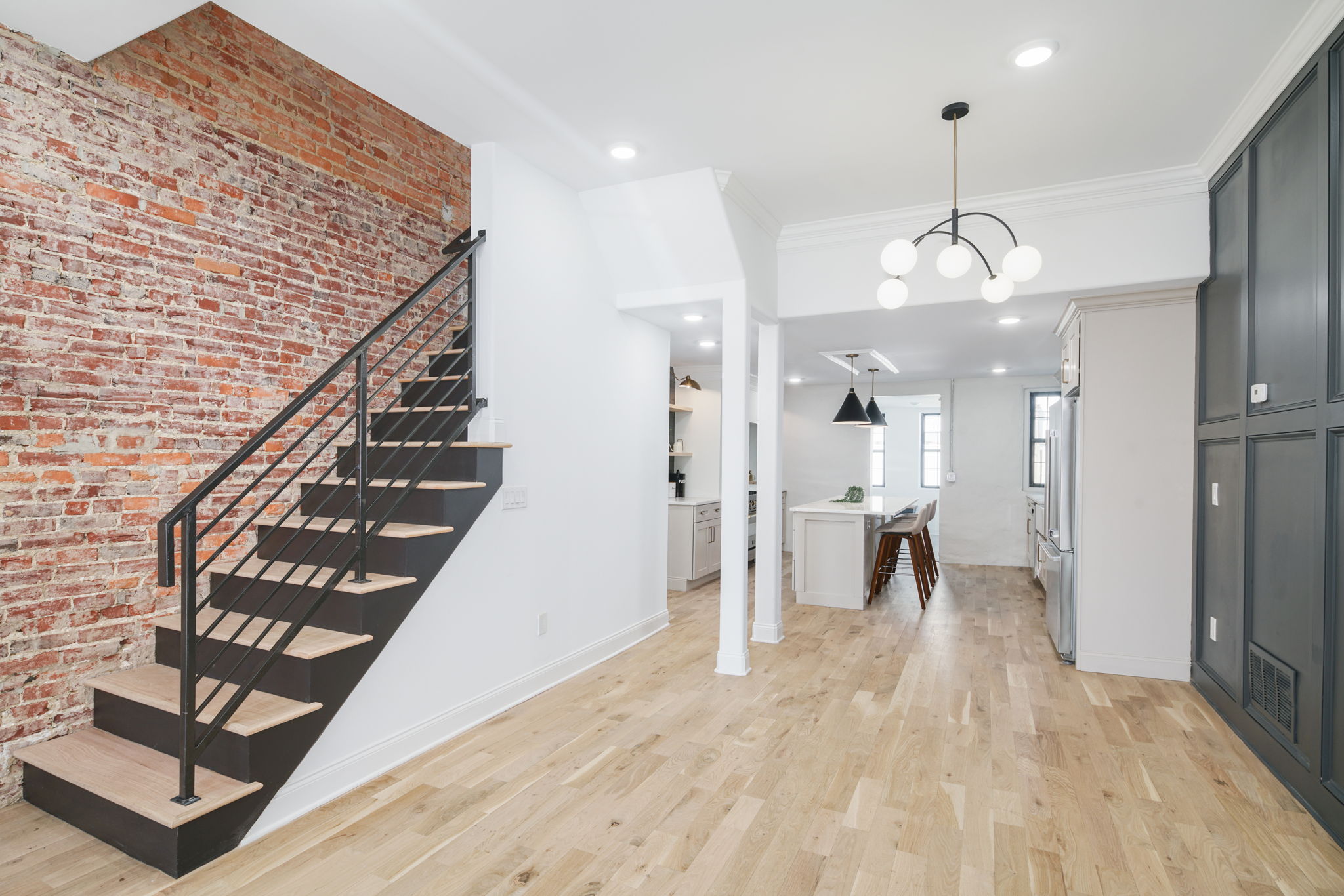 The interior highlights include exposed brick accent walls, custom millwork, and premium finishes that elevate everyday living. The well-appointed kitchen blends wood and marble elements with high-end appliances, while upper-level bedrooms and bathrooms showcase tailored tile work and designer fixtures. Located in the vibrant Newbold neighborhood, this residence reflects a timeless aesthetic with modern functionality.
