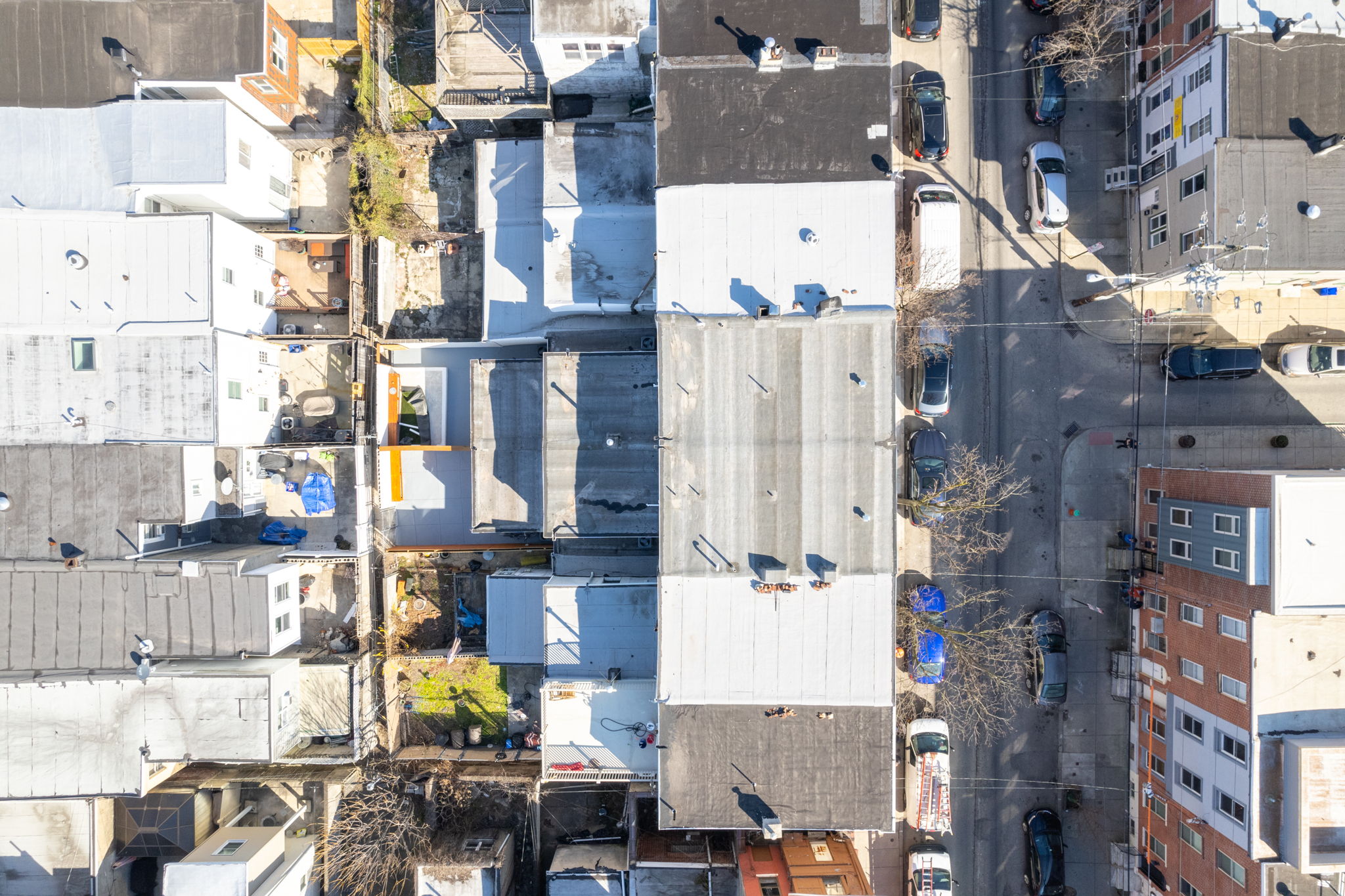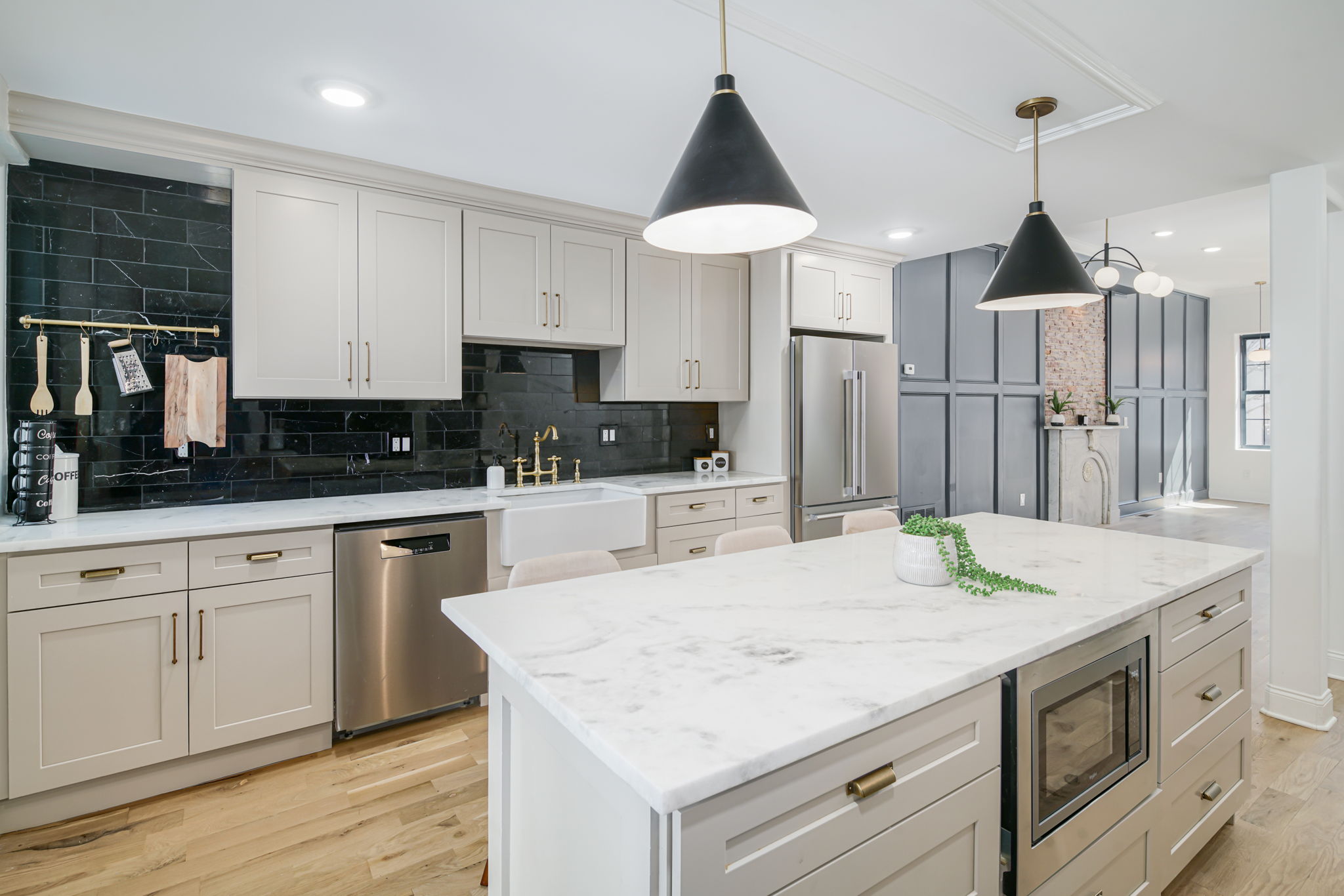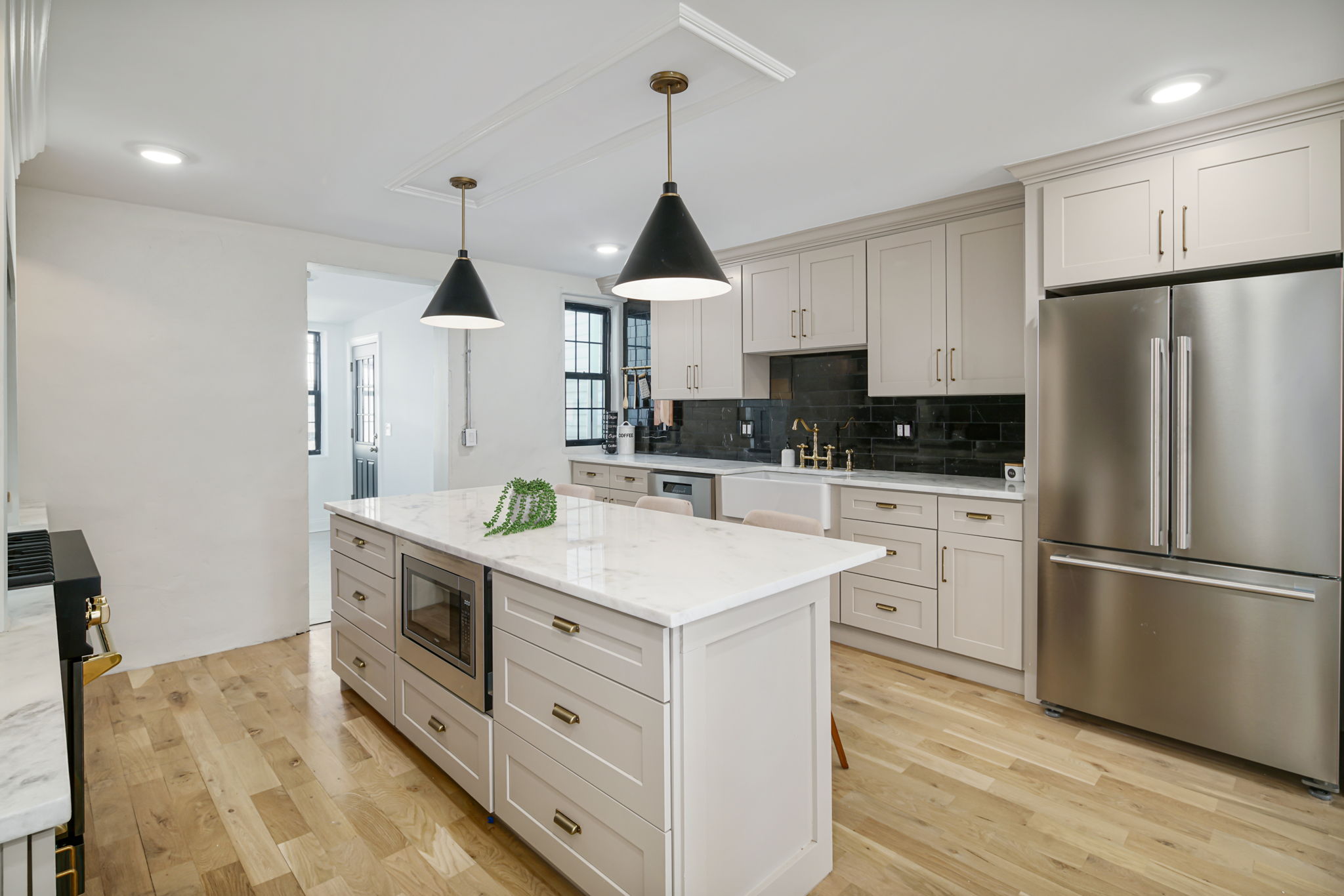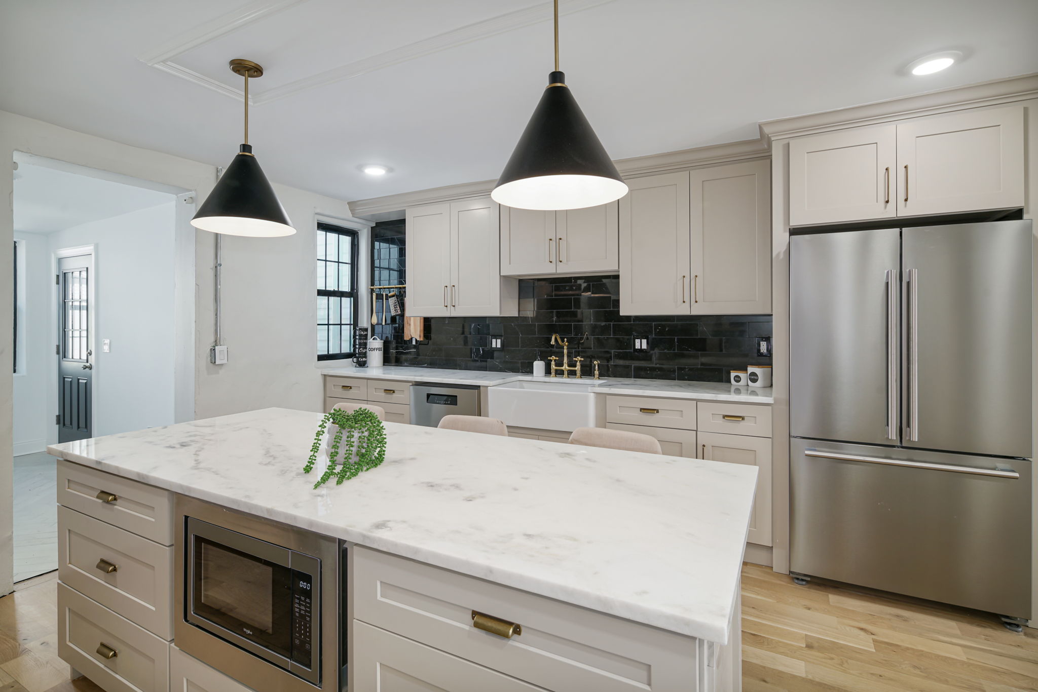 The interior highlights include exposed brick accent walls, custom millwork, and premium finishes that elevate everyday living. The well-appointed kitchen blends wood and marble elements with high-end appliances, while upper-level bedrooms and bathrooms showcase tailored tile work and designer fixtures. Located in the vibrant Newbold neighborhood, this residence reflects a timeless aesthetic with modern functionality.